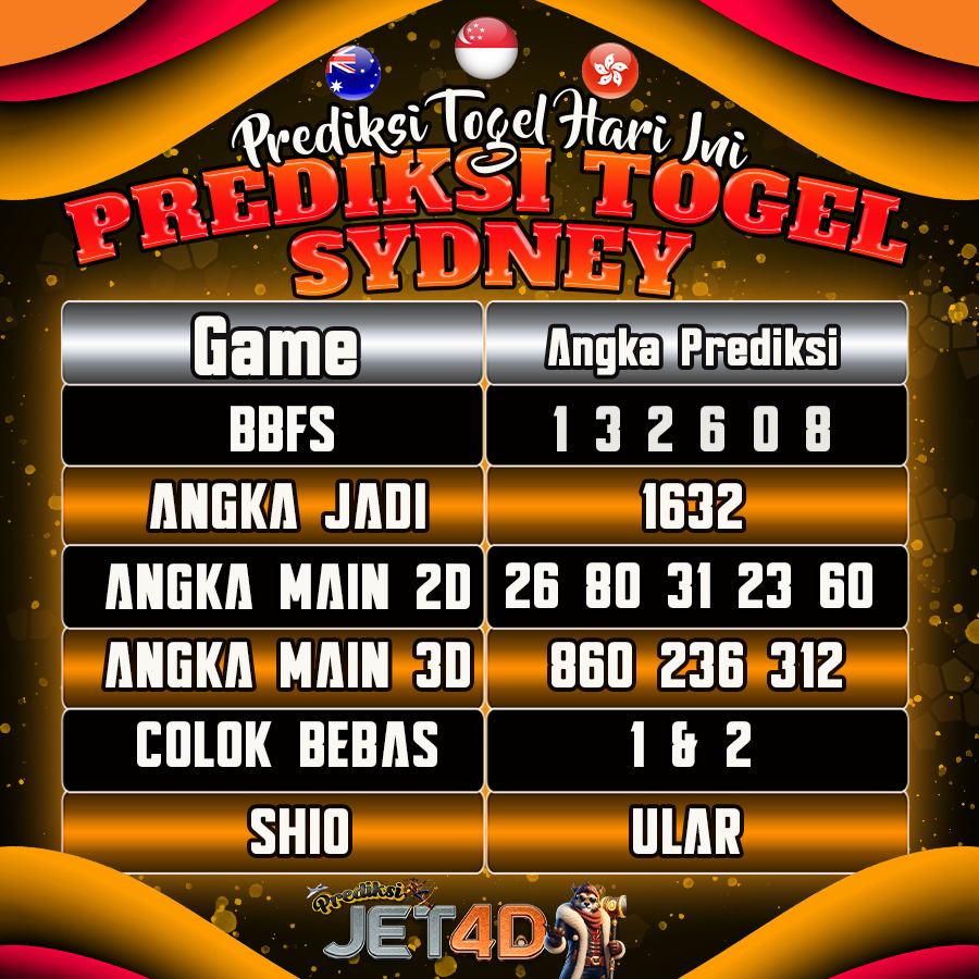 Selamat datang di Jet4d, sobat angka! Seperti biasa, kami hadir kembali dengan prediksi terbaru untuk pasaran Sydney (SDY) hari ini. Prediksi ini dirangkum dari berbagai sumber terpercaya dan analisis rumus terkini. Namun, perlu diingat bahwa ini hanyalah prediksi dan bukan jaminan kemenangan.